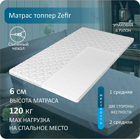 Топпер Zefir 140*200 – невысокий корректирующий матрас (ортопедический топпер-наматрасник) на основе эргономичной (анатомичной и высокоэластичной) пены ППУ поможет вам отлично откорректировать жёсткость вашего спального места. Полностью гипоаллергенный наполнитель прекрасно подойдет для выравнивания поверхности, для придания средней жесткости. На чехле удобные плотные широкие резинки по углам, для крепления к основному спальному месту, будь то основной матрас на кровати или диван. Наматрасник топпер Zefir можно сворачивать в рулон и убирать, материал хорошо сохраняет форму после перегибов, деформаций. Верхнее покрытие мягкое на ощупь, выполнено из плотного жаккарда, который обладает повышенной износостойкостью и низкой сминаемостью. Топпер (корректирующий матрас) скручен в рулон и помещен в вакуумную упаковку, принимает форму в течение 24 часов после того, как упаковка снята. Состав: пена монолит 5 см. Чехол съемный, на молнии: ткань жаккард (полиэстр), простёган стежка на гипоаллергенном волокне. Гарантийный срок – 18 месяцев, рекомендуемый срок эксплуатации 5 лет. Общая высота топпера – 6 см. Уровень жесткости: Средняя. Максимальная рекомендованная нагрузка на одно спальное место (кг) - 120 кг.
