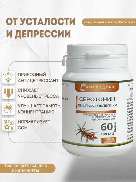 Что делает наш продукт особенным? Природный антидепрессант Серотонин, содержащийся в экстракте облепихи, работает мягко и эффективно. Он помогает забыть о тревоге, стрессах и плохом настроении. Почувствуйте легкость и уверенность в себе каждый день. Крепкий сон и бодрое утро Регулярное употребление способствует нормализации цикла «сон-бодрствование». Засыпайте легко, просыпайтесь с улыбкой и ощущением прилива сил. Сила природы для вашего здоровья Экстракт облепихи не только поддерживает нервную систему, но и улучшает работу ЖКТ, предотвращая неприятные последствия стресса. Вы будете чувствовать себя лучше, не меняя привычный ритм жизни. Почему это работает? Современные исследования доказали, что природный серотонин из облепихи усваивается организмом лучше синтетических аналогов. Это значит, что каждый прием капсул приносит реальную пользу вашему телу и разуму. Почувствуйте разницу от первого дня! Ваши выгоды: - Снижение тревожности и повышение настроения. - Здоровый сон и ясное сознание. - Укрепление нервной системы и общего тонуса. Как принимать? Принимайте всего 2 капсулы 2 раза в день во время еды, чтобы почувствовать эффект на себе. Выбирайте здоровье. Выбирайте счастье. Выбирайте экстракт облепихи. Сделайте первый шаг к улучшению своей жизни уже сегодня!