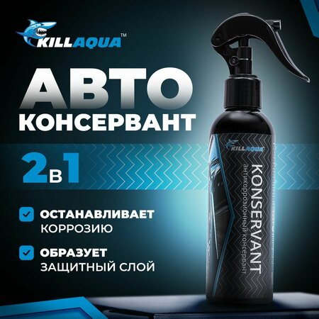 Антикоррозионный профессиональный консервант используется для защиты металлических поверхностей автомобиля от коррозии. Он останавливает разрушение и создает защитное водостойкое (гидрофобное) покрытие на поверхности металла, предотвращая окисление и иные процессы, приводящие к разрушению материала. Спрей идеально подходит для зимней консервации транспортного средства, создавая гидрофобный слой, тем самым защищая авто от грязи, реагентов, соли, растворителей, ржавчины и мелких царапин. Консервирующая жидкость прозрачная (бесцветная), быстро сохнет. Поможет остановить очаги коррозии и будет работать против их дальнейшего распространения. Содержит два вида ингибиторов: контактный и летучий, что улучшает защитные свойства. Удобный флакон антиржавчины с распылителем гарантирует экономичный расход средства, которого хватит на обработку кузова одной машины с учетом днища и арок, а также обеспечит нанесение на труднодоступные скрытые места и внутренние полости порогов, дверей. Способ применения антикора: распылите продукт с расстояния 15-20 см и равномерно распределите безворсовой тряпкой или салфеткой, оставьте на 2-3 минуты. Отполируйте обработанные участки круговыми движениями. Его можно наносить поверх старого антикоррозионного покрытия, он устойчив к неблагоприятному воздействию реагентов и влаги, а также абсолютно безопасен для пластика, резины и лакокрасочного покрытия. Консервант Kill aqua - спрей станет незаменимым помощником любого водителя и убережет автомобиль от неблагоприятных погодных условий не только зимой, но и в любое время года. Остановитель ржавчины универсален, его можно наносить не только на автомобиль, но и на прицеп, мотоцикл, и другие любые металлические изделия. Качество автохимии и автокосметики бренда килл аква подтверждено временем и множеством положительных отзывов. Преимущества: - Идеально для зимней консервации авто - Содержит 2 типа ингибиторов коррозии - контактный и летучий - Экономичный расход. 1 флакон на 1 авто включая обработку днищ - Безопасен для любых поверхностей - металл, ЛКП, резина, пластик, стекло - Концентрированный состав - Срок службы до 3-6 месяцев в российских погодных условиях - Можно обрабатывать самостоятельно - образует на обрабатываемой поверхности эластичную, прозрачную воскообразную защитную пленку - Водовытесняющее средство - Водоотталкивающий эффект