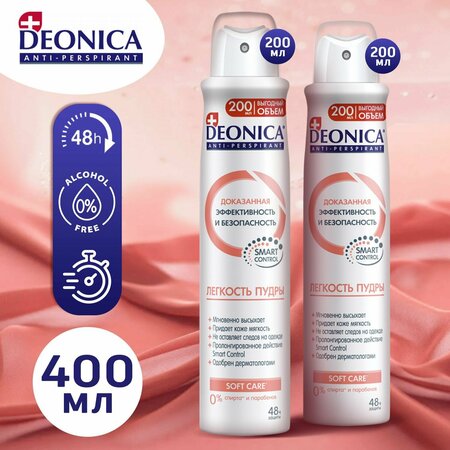 Антиперспирант аэрозольный Deonica Легкость пудры с уникальной формулой обеспечивает непревзойденную свежесть, чистоту и сухость на протяжении 48 часов. Дезик высыхает за считанные секунды, придает коже невероятную мягкость и помогает справиться с раздражениями. Едва уловимый аромат дезодоранта раскрывается в течение дня. Дезодорант женский спрей не оставляет следов на одежде. Натуральный уход, одобрен дерматологами. Имеет нежный цветочный аромат. Интеллектуальная технология SMART CONTROL с активными капсулами свежести пролонгирует действие антиперспиранта от потоотделения. Средство от пота подмышек и запаха без спирта и парабенов! Дезодорант женский аэрозоль и мужской содержит термически активированный хлоргидрат алюминия, который не забивает поры и эффективно справляется с потом и запахом без вреда для здоровья. Придает коже невероятную мягкость благодаря ингредиенту Бисаболол (получают из аптечной ромашки), который смягчает кожу и помогает справиться с раздражениями. Deonica – антиперспирант аэрозоль, который гарантированно подарит Вам защиту от пота подмышек и ощущение свежести в течение дня! Сбалансированная линейка средств рассчитана на физиологические особенности активности женщин и мужчин, на активность в течение дня и особенности кожи. С инновационным антиперспирантом нового поколения Deonica Вы сможете чувствовать себя уверенно при любых обстоятельствах. Инструкция по применению: Тщательно встряхните дезик. Распыляйте 2-3 секунды на чистую и сухую кожу подмышек с расстояния 15 см от тела