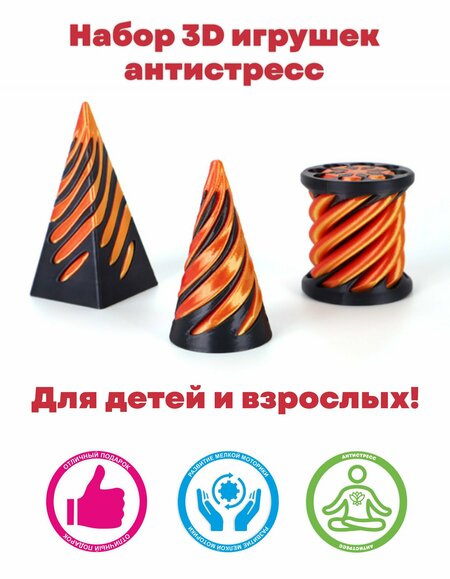 Игрушки антистресс 3D - это уникальный набор игрушек, представляющий из себя спиральные конструкции разных геометрических форм. Они сочетают в себе иллюзию и пластику. Могут быть использован как игрушки-непоседы, антистресс игрушки для взрослых, что делает их отличным подарком. Антистресс цилиндр представляет собой невозможную сквозную скульптуру пирамиды, которая является завораживающим и заставляющим задуматься шедевром. Это произведение искусства придется по вкусу ценителям уникального и станет прекрасным дополнением любого интерьера или рабочего стола. Антистресс игрушки входящие в состав набора - это не просто игрушкаи, это произведение искусства, которые способно удивить и привлечь внимание. Они станет отличным подарком для любителей уникальных вещей и тех, кто ценит мастерство и иллюзию. Это подарок, который сочетает в себе пользу для развития мелкой моторики, концентрации внимания и функцию анти-стресса. Очень хорошо развивает пространственное мышление и начальные понимания геометрии. Набор из конуса, пирамиды и цилиндра, это отличный подарок для для друзей и коллег, подходит для офисного рабочего стола и интерьера.