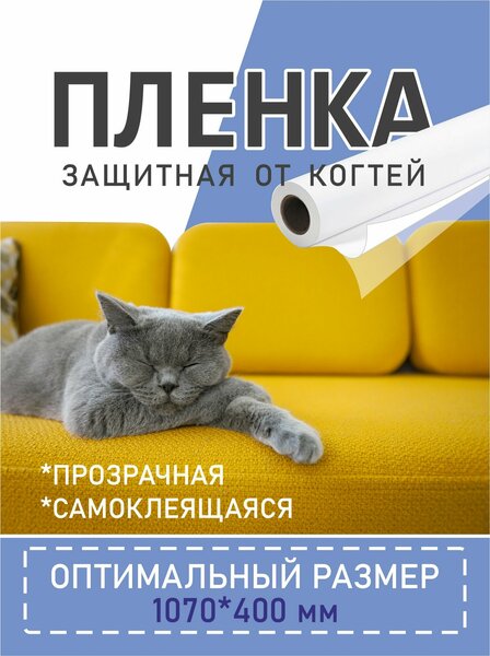 Когтеточка для кошек и собак, наша пленка обладает способностью защищать мебель и стены от когтей домашних животных. Самоклеящаяся защитная прозрачная пленка Антицарапка для кошек и собак - это не когтеточка-домик и она без столбика, но у нее и немного другая функция - вместо привлечения питомца, она его отвращает от выбранного места. По функции она похожа на коврик, но ее можно не только приклеить на пол, но и на стену, и даже на обои. На угол, на дверной косяк и на ножку стола, если ваш кот облюбовал это место. Не рекомендуем клеить на сильно поврежденную поверхность, где пленка прилегать неплотно, так как кошка сможет в таком случае зацепить когтем пленку и содрать ее. Действует она очень просто - имея гладкую глянцевую поверхность, будучи наклеена ровно и без пузырей, создает поверхность, по которой кошке становится неинтересно "точить" когти. Кот теряет интерес к этому месту. Клейте пленку пока ваш питомец этого не видит, это важно, в противном случае животное может проявить любопытство, а сильные кошки способны зацепить край пленки и потом грызть ее, постепенно отрывая. В комплекте большой лист, размером 1070х400 мм. Рекомендуем не клеить его целиком, а разрезать на полосы, шириной не менее 15 см, тогда вы получите 9 наклеек. Такие товары для животных, как пленки-антицарапки, отучают вашу кошку царапать мебель. Пленка антикошка малозаметная, и, если приклеить ее на нужную вам поверхность, не будет бросаться в глаза. Клейкое полотно легко крепится к любой ткани и снимается легко, не оставляя следов, и при этом плотно к ним прилегает и крепко держится без скоб, винтовых гвоздиков, пружинных гаек. Снимите с пленки подложку и приклейте к защищаемой поверхности. Простое решение сложной проблемы!