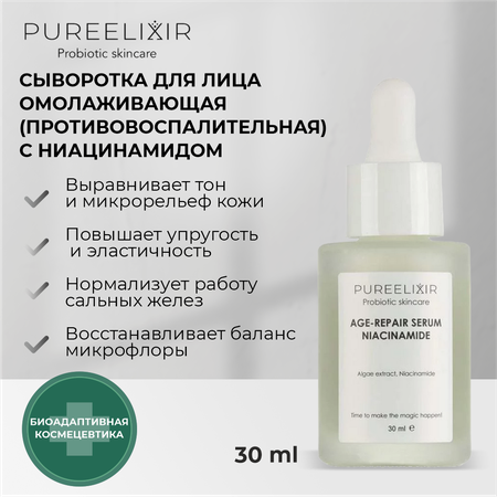 Профессиональная космецевтика для лица от Российского бренда PUREELIXIR создана для бережного ухода за кожей для него и для НЕЕ. Рекомендуется дерматологами. Нормализует микробиом кожи и ее барьерную функцию. Наши продукты сочетают в себе инновационные формулы для обеспечения стабильных результатов. В составе каждого средства содержатся пробиотики и пребиотики, позволяющие сохранять здоровое равновесие микробиома кожи. Мощный антивозрастной эффект сыворотки обеспечивается благодаря уникальной формуле, содержащей высокую концентрацию ниацинамида и экстракта сине-зеленои водоросли, которая действует как натуральный ретинол, разглаживая кожу. Ниацинамид (витамин B3) участвует в обмене углеводов и липидов, а также окислительно- восстановительных процессах кожи, поэтому способен сотворить чудеса с дермой. Укрепляет гидролипидную мантию, усиливая защитные функции тканей, повышает выработку коллагена и упругость кожи, успокаивает сальные железы, подавляет акне и воспаления, сужает поры и осветляет пигментацию. Экстракт сине-зеленой водоросли - это уникальный ANTI-AGE ингредиент против старения, схожий с растительным ретинолом. Эффективно стимулирует выработку коллагена и эластина, повышает упругость, омолаживает. Гиалуроновая кислота увлажняет и смягчает кожу, создает на поверхности защитную влагоудерживающую мантию, замедляет процессы преждевременного старения. Лизаты лакто- и бифидобактерий нормализуют работу сальных желез, подавляют развитие патогенной флоры, устраняя воспаления. Сыворотка подходит на каждый день, не содержит SLS, парабенов, силиконов и продуктов нефтепереработки.