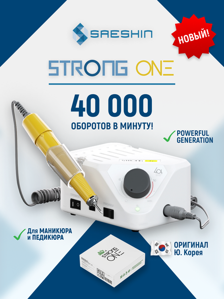 Профессиональный оригинальный аппарат для маникюра, педикюра и наращивания ногтей STRONG ONE/H350RU. Флагманская модель от Saeshin с увеличенным количеством оборотов и оригинальным дизайном. Мощность 64 Вт. Полное отсутствие вибрации. Пенал для фрез на корпусе аппарата. Мощность аппарата позволяет использовать его как для маникюра, так и для педикюра. Функция реверса. Держатель наконечника на блоке. Наконечник: скорость вращения 40 000 об/мин, габариты 153х29 мм, вес 184 г. 2S System - система двойного удержания фрезы при больших оборотах. Zero Vibration Technology - отсутствие вибрации. Система охлаждения микромотора, позволяющая избежать нагрева. Цанговый зажим фрезы: надежно фиксирует фрезу и позволяет поменять её за 3 сек. Беспрерывная работа до 12 ч. Наконечники с функцией реверса: вращение в обе стороны, использование специальных фрез. Низкий уровень шума. Оригинальный аппарат производства Южной Кореи от эксклюзивного дистрибьютора SAESHIN в России. Остерегайтесь подделок! внимание: Оригинальность аппарата проверяется на официальном сайте производителя по серийным номерам блока и ручки. Гарантия от производителя 12 месяцев.