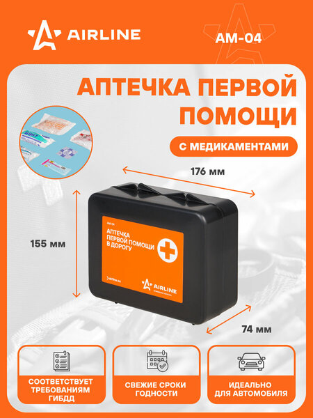 Аптечка первой помощи в дорогу, пластиковый футляр Описание: Аптечка предназначена для оказания первой помощи в дорожных условиях, на отдыхе или в поездке. Изготовлена по ТУ 9398-033-85535470-2015, РУ №РЗН 2016/3923 от 05.04.2016г. Исполнение: Аптечка первой помощи в дорогу индивидуальная. Упаковка – пластиковый футляр. Бюджетное изделие имеющее минимальный набор принадлежностей для оказания первой медицинской помощи. Не включена в Приказ МЗ РФ № 1080н от 08 окт. 2020 Характеристики: Артикул: AM-04 Соответсвует требованиям ГИБДД: да ТУ: 9398-033-85535470-2015 РУ: РЗН 2016/3923 от 05.12.2019 Вид упаковки: пластиковый футляр Комплектация: Бинт марлевый медицинский нестерильный 5м x 10 см – 1 шт. Бинт марлевый медицинский стерильный 5м x 10 см – 1 шт. Устройство для проведения искусственного дыхания “рот-устройство-рот" – 1 шт. Жгут текстильный кровоостанавливающий - 1 шт. Лейкопластырь бактерицидный не менее 1,9 см x 7,2 см – 1 шт. Салфетка антисептическая из нетканого материала спиртовая (не менее 30 мм x 60 мм) – 1 шт. Инструкция по применению – 1 шт. Пластиковый кейс – 1 шт. Гарантия: от 1 года.