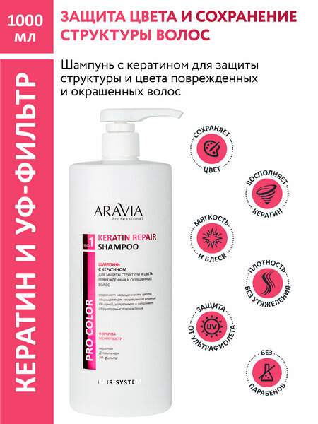 ARAVIA Шампунь с кератином для защиты структуры и цвета поврежденных и окрашенных волос Keratin Repair Shampoo, 1000 мл