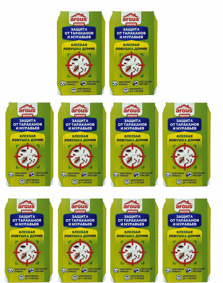 ARGUS клеевая ловушка от тараканов (домик) МИНИ 10шт – эффективное и безопасное средство для уничтожения тараканов и муравьев. Высокоэффективное и нетоксичное средство: ARGUS клеевая ловушка уничтожает тараканов абсолютно безвредно для человека и домашних животных, не оказывая раздражающего воздействия на кожу. Простота использования: клеевые ловушки Argus mini просты в применении и могут быть установлены в любом месте, в том числе в местах хранения пищевых продуктов. Вскрытые ловушки сохраняют активность в течении трех месяцев. Ловушки можно использовать как на улице, так и в помещении. Состав: каучук – 52%, производные полиизобутилена – 25%, пищевой аттрактант – 3%, масло минеральное – 20%. Для достижения наилучшего результата рекомендуется использовать несколько ловушек одновременно. ARGUS клеевая ловушка от тараканов (домик) МИНИ 10шт – надежное и безопасное решение для уничтожения тараканов и муравьев в вашем доме.