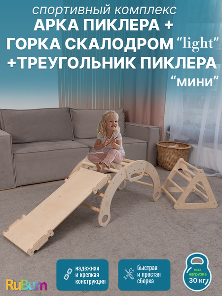 Комплект "Арка-качалка + треугольник + горка скалодром Лайт" от бренда RuBum представляет собой идеальное решение для активного отдыха и развития моторики у детей. Этот комплекс сочетает в себе три различных элемента, каждый из которых способствует физическому развитию и улучшению координации движений. Арка-качалка помогает развивать мышцы спины, рук и ног, а также улучшает баланс и координацию. Треугольник предназначен для тренировки силы и гибкости, а также для развития баланса. Горка скалодром добавляет элемент приключений и исследований, позволяя детям испытать удовольствие от подъема и спуска. Все элементы выполнены из безопасных материалов, обеспечивающих надежность и долговечность. Комплект "Арка-качалка + треугольник + горка скалодром Лайт" от RuBum – отличный выбор для создания домашнего спортивного уголка, который будет радовать вашего ребенка и способствовать его здоровому развитию.