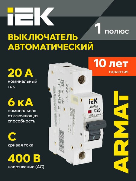 Автоматический выключатель ARMAT M06N 1Р C 20А IEK - это надежное и качественное устройство, предназначенное для защиты электрических цепей от перегрузки и короткого замыкания. Устройство обладает высокой отключающей способностью, которая варьируется от 10 до 50 кА в зависимости от номинала. Номинальная отключающая способность составляет 6 кА, что гарантирует надежную защиту электрических сетей. Автоматический выключатель ARMAT M06N оснащен электромагнитным механизмом расцепителя, который обеспечивает быстрое и точное отключение при возникновении аварийной ситуации. Регулировка теплового расцепителя позволяет настроить устройство на оптимальную работу в различных условиях эксплуатации. Устройство имеет модульную конструкцию, что позволяет легко интегрировать его в любую систему электроснабжения. Монтаж на DIN-рейку обеспечивает быстрый и удобный монтаж. Автоматический выключатель ARMAT M06N имеет номинальное напряжение 380 В и частоту тока 50 Гц. Максимальное сечение подключаемого кабеля составляет 25 мм². Тип элемента управления - поворотная кнопка, что обеспечивает удобство использования. Устройство имеет класс защиты IP20, что обеспечивает защиту от попадания твердых предметов диаметром более 12,5 мм и от воздействия воды, падающей в виде дождя под углом более 60°. В упаковке поставляется 1 автоматический выключатель. Цвет товара - белый. Выбирая автоматический выключатель ARMAT M06N 1Р C 20А IEK, вы получаете надежное и качественное устройство для защиты вашей электрической сети от перегрузок и коротких замыканий.