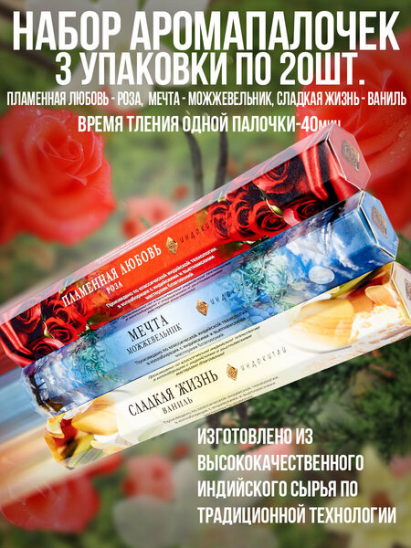 Ароматы: роза, можжевельник, ваниль, Наборы благовоний от бренда "Индокитай" - это отличный выбор для ароматерапии, создания настроения для медитации, и уютной атмосферы с помощью ароматических палочек. В каждом наборе три различных упаковки ароматических палочек с разными ароматами, в каждой шестигранной упаковке 20 ароматических палочек. Таким образом в наборе 60 ароматических палочек. Благовония "Индокитай" изготовлены на угольной основе из натуральной бамбуковой стружки - "масала". Ароматическую палочку зажечь, через 7-8 секунд потушить пламя. Тлеющую палочку поместить на подставку. Срок годности в закрытой упаковке неограничен, после вскрытия упаковки - использовать в течении года. При использовании ароматической палочки может образовываться довольно большое количество дыма, поэтому использование возможно только в проветриваемых помещениях. Тлеющие палочки следует держать горящие палочки в стороне от окон и дверей, вдали от легковоспламеняющихся предметов, в месте недоступном для детей. А