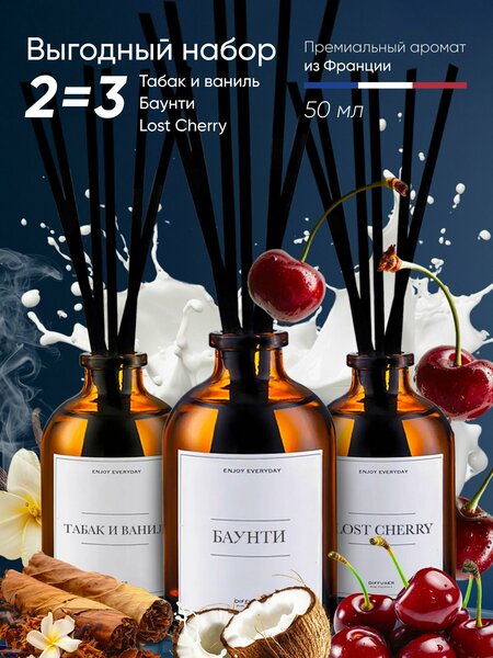 Набор Ароматических диффузоров - полезный аксессуар для дома. Аромадиффузор с палочками подчеркнет дизайн интерьера и поможет создать ощущение уюта и комфорта. Ароматный освежитель воздуха подарит гармонию и вдохновение. Домашний парфюм от Enjoy Everyday - качественный, стойкий, универсальный. Арома диффузер изготовлен из натуральных эфирных аромамасел из Франции; палочками из фибры можно регулировать интенсивность парфюмерной композиции, они качественно распределяют приятный аромат, долго служат; ароматизатор станет украшением любой комнаты и помещения, оригинальным подарком на любой праздник, для особого случая, любимых, родных, близких людей. Максимальная схожесть с оригинальными духами. Стойкость наполнителя для диффузора 2-3 месяца.