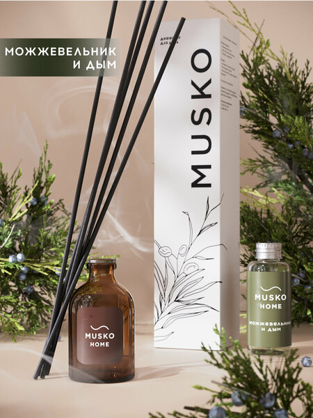 Диффузор для дома с палочками в стеклянном флаконе Classic от MUSKO HOME - изысканный и функциональный предмет декора. Широкая арома линейка и дизайн флакона позволит вам подобрать аромадиффузор с палочками для любого интерьера. От домашнего уютного уголка до таких стилей, как скандинавский, минимализм или джапанди, наполняя помещение (будь то ванная, гостиная или спальня) приятным ароматом и создавая особую атмосферу. Можжевельник и дым - высокие ноты хвои и ягод можжевельника перенесут Вас в самое сердце лесного царства. Ноты аниса, розового перца, кожи и пачули добавляют аромату сложности и очарования. Успокаивающие ноты кашемирового дерева, кедра и мускуса создают теплую уютную атмосферу.