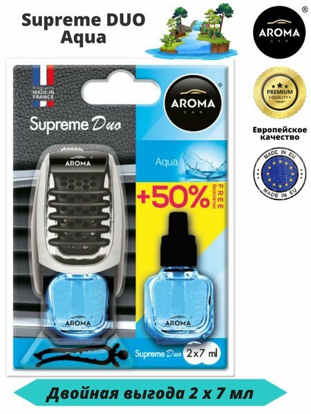 Ароматизатор в машину Aroma Car Supreme Duo на дефлектор 7 мл. со сменным флаконом, двойная выгода. Ароматизатор в авто поможет создать ощущение свежести и уюта в автомобиле. Для тех, кто проводит много времени за рулем особенно важно поддерживать чистоту и свежесть в салоне. Правильно подобранный для автомобиля аромат помогает поднять настроение и улучшить концентрацию. Ароматизатор можно легко закрепить на горизонтальном или вертикальном дефлекторе. Ароматизатор произведен на основе натуральных масел. Одного блока хватает на 60 дней использования. Aroma Car производит высококачественные ароматизаторы, в производстве которых используются только качественные ингредиенты и соответствуют Европейским стандартам качества, Сделано в Польше. Ароматизатор отлично подойдет в подарок для коллеги, любимого, друга, подруги, любимой, а также для себя, порадуй своих родных и близких, будет отличным подарком в конкурсах. на Новый год, 8 марта, 23 февраля и просто так.