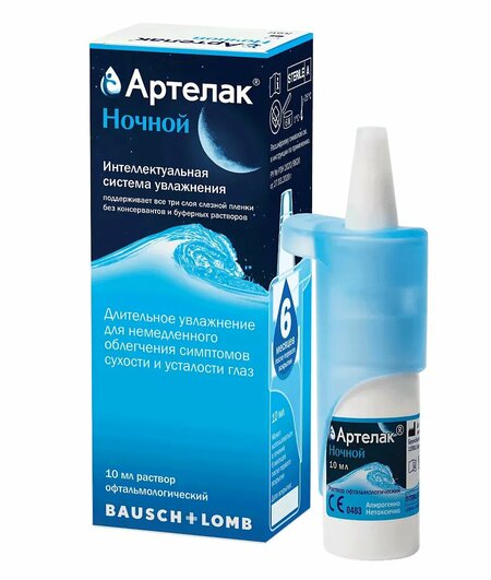 Артелак Ночной представляет собой офтальмологический раствор, содержащий 0.24% гиалуроновой кислоты (в форме натрия гиалуроната). Передовая формула обладает очень хорошей переносимостью, поскольку не содержит консервантов и буферов. Медицинское изделие не содержит в своем составе лекарственное средство. Раствор офтальмологический представлен в доработанной инновационной многодозовой системе, не содержащей консерванты, которую просто и безопасно использовать. После вскрытия флакон с каплями можно использовать в течение 6 месяцев. Артелак Ночной это средство для комплексного увлажнения, которое поддерживает все три слоя слезной пленки: липидную, водную и слизистую фазу с целью улучшения и поддержания увлажненности глазной поверхности при любых симптомах сухости и дискомфорта в глазах. Липидный компонент – среднецепочечные триглицериды, обладает защитным эффектом, уменьшая испарение липидного слоя в слезной пленке. Натуральный увлажнитель – гиалуроновая кислота (в форме гиалуроната натрия), которая обнаруживается в структурах глаза здорового человека и в натуральной слезной пленке в совокупности с глицерином (глицеролом) притягивает влагу, поддерживая и восстанавливая водный слой в слезной пленке. Компонент карбомер за счет своей вязкой структуры связывает молекулы воды, восстанавливает муциновый слой. Карбомер также обладает длительным увлажняющим действием. Артелак Ночной – средство для сохранения здорового состояния поверхности глаза, распределяется на поверхности и обеспечивает интенсивное увлажнение для немедленного и длительного облегчения симптомов. Это идеальный продукт для любого потребителя, страдающего от таких симптомов сухости глаз, как усталость, раздражение, жжение и/или слезоточивость. Может применяться как в домашних условиях, так и в ЛПУ.