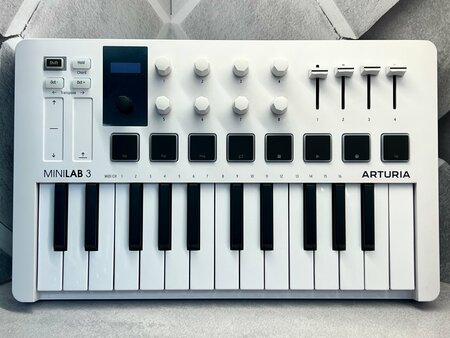Клавиатура: 25 миниатюрных клавиш, синтезаторная механика, чувствительность к скорости нажатия Контроллеры: 16 поворотных безупорных регуляторов 2 банка х 8 падов с RGB подсветкой 8 поворотных энкодеров 4 слайдера сенсорные полоски pitch и modulation Функции: экранчик с ручкой управления встроенный арпеджиатор режим аккордов скрипты для популярных DAW транспортные кнопки DAW Подключение: USB-С разъем MIDI DIN выход разъем для сустейн педали Габариты: 355 x 220 x 50 мм Вес: 1,5 кг Комплектация: USB-кабель 500 звуков библиотеки Analog Lab Intro, Ableton Live Lite, UVI Model D рояль, Native Instruments пианино, 2 месяца подписки на Loopcloud 2, уроки музыки от Melodics