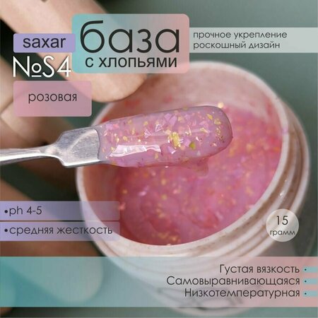 Российский производитель для профессионалов и новичков База камуфлирующая SAXAR № S4, розовая с хлопьями, 15 гр Прочное укрепление роскошный дизайн -средняя жёсткость -ph4-5 -густая вязкость -самовыравнивающаяся -низкотемпературная -укрепление натуральной ногтевой пластины -роскошный дизайн ногтей особенности: Концентрация пигмента в составе средняя, тонирование без эффекта гель-лака способ применения: 1. подготовить ноготь к покрытию (поднять чешуйки натуральной ногтевой пластины пилкой 180 грит, выполнить маникюр) 2. обезжирить (рекомендуем использовать в качестве обезжиривателя спирт) 3. нанести прозрачную базу втирающими движениями (в качестве защиты натурального ногтя и для последующего безопасного снятия цветного покрытия при коррекции) и высушить в LED лампе 48w 30сек 4. нанести камуфлирующую базу тонким слоем на ноготь близко к кутикуле и боковым валикам (не сушить), поставить необходимую каплю базы в центр ногтевого ложа и выровнять (толщина слоя покрытия не должна превышать 1,5мм), перевернуть руку ладонью вверх, для центрирования материала и достижения идеального блика, высушить в LED лампе 48w 60сек 5. нанести цвет или выполнить дизайн 6. закрепить топом преимущества: - не меняет оттенок -среднекислотная -не печет -хлопья в составе базы не мешают самовыравниванию -длительная носка -стойкое покрытие без сколов и повреждений -укрепление натуральной ногтевой пластины и дизайн 2 в 1 удобство: -комфортное нанесение - удобная вязкость, не течет -самовыравнивается важно! для тёмных оттенков время полимеризации увеличивается в 2 раза при высушивании базы в лампе на тонких ногтях возможно ощущение тепла. Терпеть не надо. Необходимо предупредить клиента убрать руки из лампы, перевернуть ладонью вверх, чтобы база не стекла, подождать секунду и снова поместить руки в лампу, чтобы завершить процесс полимеризации. Обращаем ваше внимание на то, что баночка с высокими бортиками. Это сделано для того, чтобы в процессе транспортировки и последующей эксплуатации, материал не вытекал. Количество грамм материала в банке ровно столько, сколько заявлено.