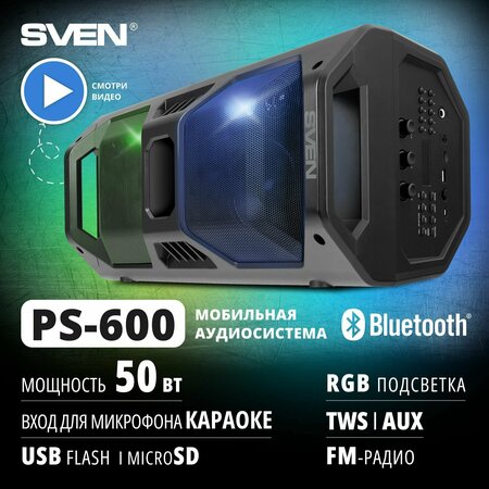 "Большая портативная колонка Sven PS-600 - это мощный звук в крепком и надежном корпусе с подсветкой, эквалайзером и глубокими басами. Колонка поддерживает не только Bluetooth-подключение, но и проводное соединение, а также воспроизводит файлы, записанные на флешки USB-flash и карты памяти microSD. Кроме того, можно воспользоваться встроенным радиоприемником FM-радио и доверить выбор треков диджеям любимой радиостанции. Звуковая Bluetooth колонка подходит для телефона, планшета и ноутбука (подключается через блютуз или аудио кабель). Подключите в режиме TWS две колонки к смартфону и наслаждайтесь фантастическим и громким стерео звучанием. Для любителей песен есть два входа 6,3 мм для подключения караоке микрофона. музыкальная аудиосистема подходит для вечеринок на даче, дома, на улице, в спортзале или автомобиле. Переносная акустическая система со светомузыкой мощностью 50 Вт подарит вам до 10 часов непрерывного невероятного чистого звука. В устройство встроены сразу две пары динамиков — высокочастотные диаметром 35 мм и низкочастотные диаметром 100 мм. Они обеспечивают потрясающе широкий частотный диапазон: от 45 Гц до 22 кГц — что порадует любителей сбалансированного звука с выраженным басом. В создании атмосферы праздника поможет динамическая подсветка динамиков, цветомузыка которой эффектно дополняет дизайн акустики. Вся информация о работе большого бумбокса отображается на ярком LED-дисплее, для удобства переноски предусмотрена удобная ручка. Продолжительную автономную работу SVEN PS-600 гарантирует литий-ионный аккумулятор емкостью 4000 мAч. PS-600 – напольная аудиосистема для воспроизведения музыки, которая сочетает в себе удобство, качественный звук и стильный дизайн!"