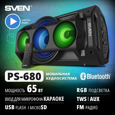 Погрузитесь в мир музыки с беспроводной портативной колонкой SVEN PS-680! Музыкальная аудиосистема, мощностью 65 В, - идеальное решение для мероприятий любого масштаба. Три больших динамика обеспечивают глубокий звук без искажений. Низкочастотный динамик колонки имеет диаметр 140 мм, а два средне- и высокочастотных — 70 мм. Широкий частотный диапазон от 45 Гц до 22 кГц позволяет услышать каждую ноту ясно и отчетливо. Встроенный эквалайзер позволяет настроить звук по вашему предпочтению, создавая при этом ощутимый акцент на басах. Наслаждайтесь громким и качественным звуком в любом месте благодаря бумбоксу с поддержкой Bluetooth. Соедините ваше устройство по блютуз и наслаждайтесь любимой музыкой без проводов! Акустическая система поддерживает технологию TWS, благодаря ей можно синхронизировать 2 устройства SVEN, подключить их к одному смартфону и создать стерео пару. Также проигрыватель оснащен USB-flash и microSD слотами для воспроизведения музыки с флешки. Встроенный радиоприемник с FM радио позволит наслаждаться любимыми радиостанциями. Помимо беспроводного соединения, в колонке предусмотрено проводное подключение через порт AUX. Переносная акустика оснащена двумя входами 6,3 мм для подключения микрофонов, благодаря чему вы можете создать настоящую караоке вечеринку дома, на улице, на даче или в гараже. А светомузыка динамиков создаст неповторимую атмосферу. Автономную работу до 10 часов обеспечивает встроенный аккумулятор емкостью 4400мА*ч. Мощная аудио колонка PS-680 - идеальное решение для вашей музыкальной системы. Наполняйте жизнь музыкой вместе со SVEN!