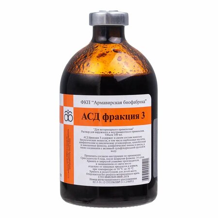 АСД фракция 3 назначают животным для лечения инфицированных вяло заживающих ран, дерматитов, хронических воспалительных поражений кожи и копыт, трофических язв, свищей, копытной гнили овец и некробактериоза животных, а также гинекологических заболеваний различной этиологии.