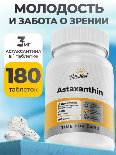 VitaMeal Astaxanthin - это источник астаксантина в таблетках. Астаксантин относится к каротиноидам, является природным пигментом красного цвета и присутствует в тканях, например, некоторых лососевых рыб, планктона, креветок и отдельных водорослей. Организм человека не вырабатывает астаксантин. Но почему он так ценен? В организме человека постоянно происходят реакции обмена веществ с участием кислорода, в процессе которых образуются не только полезные и нужные вещества, но и молекулы свободных радикалов. Свободные радикалы готовы вступать в реакции с любыми клетками, повреждая и “захватывая” их. Этот процесс называется окисление. Если он запущен, то свободных радикалов может становиться всё больше. Они также поступают извне - с загрязненным воздухом, из-за курения, с едой или водой. Чем больше свободных радикалов, тем сильнее окислительный стресс. А он, в свою очередь, провоцирует развитие серьезных заболеваний и ускорение процессов старения. Для борьбы с окислительным стрессом применяют вещества-антиоксиданты. Именно астаксантин известен своими мощнейшими антиоксидантными свойствами. Согласно исследованиям, он более, чем в 6000 раз превосходит антиоксидантную активность витамина С. Некоторые антиоксиданты (тот же витамин С) могут превращаться в прооксиданты и только усиливать окисление, нанося ещё больший вред организму. Астаксантин не превращается ни в прооксидант, ни в витамин А (в отличие от других каротиноидов) и не причиняет вред клеткам тела человека, а наоборот: