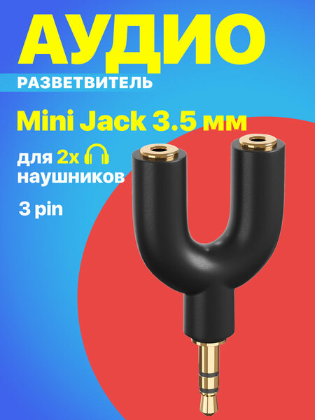 Аудио сплиттер переходник GSMIN Prism разветвитель адаптер для 2 двух наушников Mini Jack джек 3.5 мм для смартфона, ноутбука, ПК (Черный).