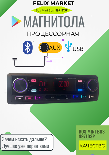 Автомагнитола Bos-Mini-N971DSP 1DIN - это компактное и мощное устройство для вашего автомобиля, которое обеспечивает высококачественный звук и удобное управление. Мощный звук: благодаря процессору DSP и мощному усилителю, магнитола обеспечивает чистое и громкое звучание. Цветной RGB экран: яркий и информативный дисплей с диагональю 4 дюйма и форматом 4:3. Bluetooth: беспроводное подключение смартфона для музыки и звонков. Множество разъемов: AUX, USB, Type-C для подключения различных устройств. 9 выходов RCA: возможность подключения дополнительного аудиооборудования. Характеристики: ✅ Формат: 1 DIN ✅ Bluetooth: Да ✅ Разъемы: AUX, USB, Type-C ✅ Процессор: DSP (цифровая обработка звука) ✅ Экран: Цветной RGB ✅ Охлаждение: Мощный радиатор ✅ Выходы RCA: 9 выходов ✅ Съемная панель: Да ✅ Комплектация: Пульт управления, все провода для подключения магнитола автомобильная; автомагнитола; магнитола; автомагнитола 1 din; магнитола 1 din; автомагнитолы Съемная панель и мощный радиатор охлаждения: обеспечивают безопасность и долговечность устройства. Пульт и провода для подключения идут в комплекте. Совместимость с различными моделями автомобилей: подходит для Lada (ВАЗ), Toyota, BMW, Mercedes-Benz, Mitsubishi, Ford, Opel, УАЗ, Volkswagen, Volvo и других автомобилей. Автомагнитола Bos-Mini-N971DSP 1DIN - это отличный выбор для тех, кто ценит качество звука и удобство управления в своем автомобиле. Закажите прямо сейчас и получите все необходимое для установки в комплекте.