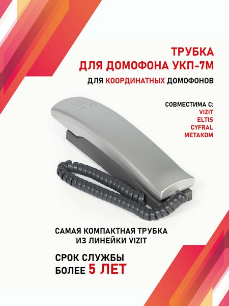 Трубка аудиодомофона УКП-7М предназначена для работы в составе координатных подъездных и индивидуальных домофонов VIZIT(Визит), Cyfral (Цифрал), Eltis (Элтис), Metakom (Метаком, кроме серии 2007) и других схожих систем. Домофонная трубка обеспечивает дуплексную связь (одновременно могут говорить и посетитель, и абонент). На корпусе переговорного устройства расположены: кнопка удаленного отпирания замка, которая работает во время разговора с посетителем, и переключатель для регулировки громкости звонка. Существует 2 режима громкости: “Громкий” и “Тихий”, ночной режим, при котором звонок слышно, но очень тихо, без возможности полного отключения звука. Переключение режимов также влияет на громкость разговора с посетителем. Корпус трубки выполнен из качественного пластика цвета “Серебристый металлик”. Подключить трубку можно самостоятельно. Отлично подойдет в качестве подарка на новоселье.