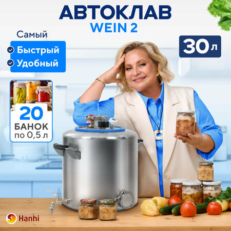 Автоклав домашний Wein 2 - это универсальный кухонный заготовщик на 30 литров для консервации рыбы, мяса, птицы, овощей по любимым рецептам. Работает в паровом и жидкостном режимах, и экономит ваше время в сезон заготовок. Гарантия 3 года. Быстрая фиксация крышки автоклава благодаря байонетному соединению. Буквально одно движение, и все на месте. Больше никаких рым-болтов и гаек! Крышка крепится намертво, риска стравливания нет. Толщина 3 мм. Она не выгнется даже при избыточном давлении. Края крышки фиксируются в пазах, где находится силиконовое уплотнение, что гарантирует абсолютную герметичность. Автоматический выход на рабочий режим при готовке «на пару». Вам не нужно вручную перекрывать кран после стравливания воздуха. Новый клапан сам закрывается в нужный момент под действием внутреннего давления автоклава, избавляя вас от необходимости стоять у аппарата и выжидать нужный момент. Следить за временем приготовления блюд можно по показаниям термометра и манометра. Паровой автоклав Вейн нового поколения вмещает 20 банок консервов за одну загрузку. 2 режима работы - на пару и на воде. Время приготовления блюд сократится в разы, освободив вас от длительного стояния у плиты. В аппарат для приготовления тушенки можно загружать классические закаточные банки и банки с закручивающимися твист-офф крышками. Для стерилизации продуктов в паровом режиме потребуется залить в бак всего 2,5 л воды. Автоклав для тушенки сделан из пищевой нержавеющей стали AISI 304, толщина стенок и дна 1,5 мм. Автоклав домашний можно нагревать на: газовой, электрической, стеклокерамической плитах. Не подходит для индукционных плит! Вы можете приобрести и установить автоматический блок управления и использовать его как электрический автоклав с ТЭНом для дома и дачи. Универсальный блок нагрева приготовит консервы от «а» до «я» без вашего участия! В нем уже есть встроенные рецепты для самых популярных блюд. После закладки продуктов и закрытия автоклава вся готовка происходит без вас. Не нужно следить за временем и температурой — блок сам делает это на протяжении всего процесса. Об окончании готовки автоклав известит звуковым сигналом. Автоклав удобно промывать. Все приборы находятся на крышке сверху. Чтобы обезопасить их от влаги, достаточно снять ее и убрать в сторону. Также крышку можно перевернуть и установить на аппарат приборами внутрь. Так вы будете уверены в сохранности наиболее хрупких частей устройства при перевозке или хранении аппарата. В подарок вы получите: набор винтовых крышек, набор специй в подарочной упаковке и книгу рецептов. Превращайте свой автоклав в самогонный аппарат и удивляйте гостей домашними напитками, самогоном, настойками, виски, джином и другими дистиллятами крепостью до 96,6%! Для этого на крышке есть кламп на 2 дюйма для установки бражной колонны.