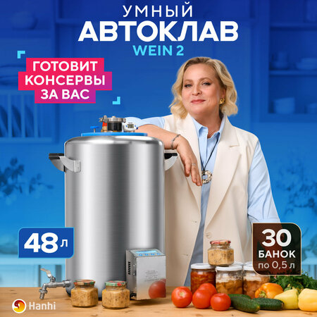 Электрический автоклав домашний Wein 2 - гтовить консервы с ним легко, удобно и быстро! Автоматический автоклав сам проследит за температурой и временем готовки, сам отключит нагрев, когда консервы будут готовы. От вас потребуется лишь положить заготовки в аппарат и нажать на кнопку. Это универсальный кухонный заготовщик на 48 литров для консервации рыбы, мяса, птицы, овощей. Автоклав работает в паровом и жидкостном режимах. Полная автоматизация готовки благодаря блоку управления автоклавом с ТЭНом. В памяти автоматики уже внесены проверенные рецепты для консервирования. Блок управления работает в автоматическом и ручном режимах, а также в формате ТЭНа для самогоноварения с плавной регулировкой нагрева до 3 кВт. Быстрая фиксация крышки автоклава благодаря байонетному соединению. Буквально одно движение, и все на месте. Больше никаких рым-болтов и гаек! Крышка крепится намертво, риска стравливания нет. Толщина - 3 мм. Она не выгнется даже при избыточном давлении. Края крышки фиксируются в пазах, где находится силиконовое уплотнение, что гарантирует абсолютную герметичность. Автоматический выход на рабочий режим при готовке «на пару». Вам не нужно вручную перекрывать кран после стравливания воздуха. Новый клапан сам закрывается в нужный момент под действием внутреннего давления автоклава, избавляя вас от необходимости стоять у аппарата и выжидать нужный момент. Следить за временем приготовления блюд можно по показаниям термометра и манометра. Паровой автоклав Вейн вмещает до 40 банок консервов по 0.5л за одну загрузку или до 30 банок с подключенным блоком управления. Время приготовления блюд сократится в разы, освободив вас от длительного стояния у плиты. В аппарат для приготовления тушенки можно загружать классические закаточные банки и банки с закручивающимися твист-офф крышками. Для стерилизации продуктов в паровом режиме потребуется залить в бак всего 2,5 л воды. Безопасный автоклав для тушенки сделан из пищевой нержавеющей стали AISI 304, толщина стенок и дна 1,5 мм. Автоклав домашний можно нагревать на: газовой, электрической, стеклокерамической плитах. Не подходит для индукционных плит! Автоклав удобно промывать. Все приборы находятся на крышке сверху. Чтобы обезопасить их от влаги, достаточно снять ее и убрать в сторону. Также крышку можно перевернуть и установить на аппарат приборами внутрь. Так вы будете уверены в сохранности наиболее хрупких частей устройства при перевозке или хранении аппарата. В подарок вы получите: набор винтовых крышек, набор специй в подарочной упаковке и книгу рецептов. Превращайте свой электро автоклав в самогонный аппарат и удивляйте гостей домашними напитками: самогоном, настойками, джином и другими дистиллятами крепостью до 96,6%! Для этого на крышке есть кламп на 2 дюйма для установки любой бражной колонны. Также в комплекте есть фальшдно. С его помощью можно получить различные ароматные напитки наподобие виски, бурбона, коньяка, ароматную водку. Отдыхайте или занимайтесь любимым делом, не отвлекаясь на готовку — с Wein 2 это стало возможно! Автоматический автоклав WEIN 2 - это домашний стандарт для консервации!