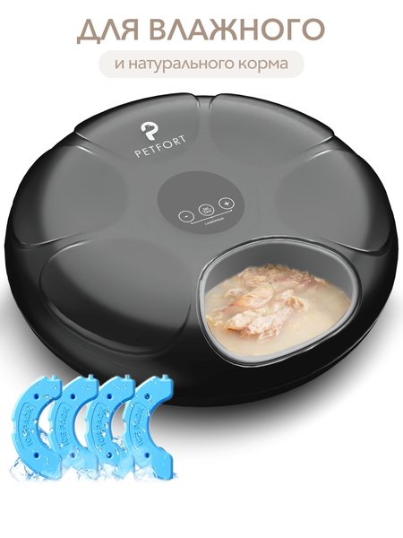 Автоматическая кормушка для влажного корма от PETFORT на 6 секций: удобство и контроль кормления Автоматическая кормушка для животных PETFORT предназначена для собак и кошек и обеспечивает удобство и контроль кормления. Интерактивность и установка графика кормления PETFORT оснащена интерактивным режимом, позволяющим устанавливать график кормления и следить за количеством подаваемого корма. Это позволяет обеспечить оптимальное питание для вашего питомца и избежать перекармливания. На подставке и подходит для влажного и сухого корма Автоматическая кормушка PETFORT выполнена из прочного пластика и имеет объем 1.2 литра, что позволяет вмещать достаточное количество корма для вашего питомца. Она подходит для влажного и сухого корма и устанавливается на подставке, что обеспечивает устойчивость и безопасность использования. Комплектация и вес товара В комплект автоматической кормушки PETFORT входят: автоматическая кормушка, два охлаждающих блока, USB-кабель Type-C и инструкция на русском языке. Вес товара составляет 1300 грамм, что делает его легким и удобным для транспортировки и установки. Выбирая автоматическую кормушку для животных PETFORT, вы обеспечиваете своему питомцу комфортное и здоровое питание, а себе – спокойствие и уверенность в том, что ваш любимец всегда сыт и доволен.