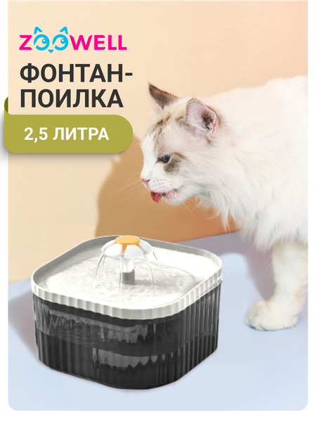 Поилка для кошек имеет ультра тихий насос и не напугает вашего питомца! Ваш питомец будет доволен! Поилка-фонтан ZooWell привлекательна для кошек, маленьких собачек и хорьков, стимулирует животных употреблять достаточное количество воды, поддерживая оптимальный уровень водно-солевого баланса Вашего любимца. Питомец всегда будет иметь доступ к свежей проточной воде! Даже если вас нет дома. Питьевой фонтан для кошек - это 4-ступенчатая циркуляционная система фильтрации. Система использует сменный фильтр для очистки воды, удаления грязи и пищевых частиц. Фильтр состоит из слоев хлопка, активированного угля, кокосовой скорлупы и ионообменных смол. Он обеспечивает свежую чистую воду для ваших питомцев. Губчатый фильтр на водяном насосе будет улавливать волосы и мусор, что обеспечивает правильную работу насоса. Сменный фильтр, губчатый фильтр и водяной насос. Насос съемный и моющийся. Особенности: Поилка для кошек имеет классический цветочный дизайн. Полупрозрачный диспенсер для воды Cat со светодиодной подсветкой. Питьевой фонтан для кошек изготовлен из пищевых материалов, без BPA материалов.