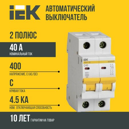 Автоматический выключатель IEK ВА 47-29 (C) 2P электромагнитный 4,5kA 40А - надежное и качественное решение для защиты вашей электрической системы. Автоматический выключатель предназначен для защиты распределительных и групповых цепей, имеющих различную нагрузку. Он обеспечивает надежную защиту электроприборов, освещения, выключателей с характеристикой В, двигателей с небольшими пусковыми токами (компрессор, вентилятор), а также двигателей с большими пусковыми токами (подъемные механизмы, насосы). Выключатель имеет номинальный ток 40 А, количество полюсов - 2, тип расцепления - C, отключающую способность - 4,5 кА, номинальное напряжение - 220 В, тип напряжения - переменное (AC), механизм расцепителя - электромагнитный, класс защиты (IP) - IP20. Монтаж выключателя осуществляется на DIN-рейку, что обеспечивает удобство и быстроту установки. В упаковке поставляется 1 автоматический выключатель. Выбирая автоматический выключатель IEK ВА 47-29 (C) 2P электромагнитный 4,5kA 40А, вы получаете надежное и качественное решение для защиты вашей электрической системы, а также удобство и простоту монтажа на DIN-рейку.