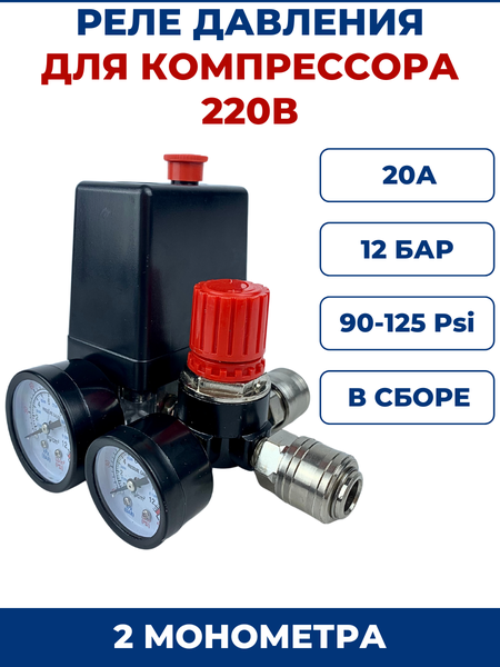 Автоматика для компрессора 220В с манометрами-реле давления, так же известная как телепрессостат - это надежное решение для автоматизации работы вашего компрессора. Данная система имеет номинальное напряжение 220В, обеспечивая точное управление давлением в ресивере поршневого компрессора, гарантируя его эффективную и безопасную эксплуатацию. Реле давления для компрессора, входящее в комплект, позволяет задать рабочее давление, которое может варьироваться в пределах 90-125 фунтов на квадратный дюйм, обеспечивая оптимальные условия для работы вашего оборудования. Благодаря этой системе вы можете быть уверены в стабильной работе компрессора и отсутствии необходимости постоянного контроля давления. автоматика для компрессора 220 в сборе с манометрами-реле давления - это залог надежности, эффективности и долговечности вашего оборудования.