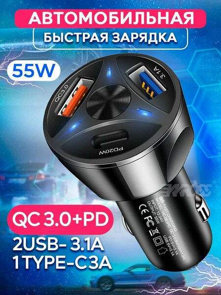 Автомобильная зарядка или разветвитель прикуривателя с usb и type c в машину с тремя портами для зарядки смартфонов, планшетов, навигаторов или другой цифровой техники, дает стабильный поток энергии. Разветвитель в прикуриватель автомобиля можно подключать в стандартное гнездо прикуривателя автомобильного, с входным напряжением 12-24В. Выходные разъемы: первое гнездо с разъёмом type C PD20W, второе гнездо USB A 3.1A, третье - USB A QC 3.0, удобно использовать для параллельной зарядки нескольких гаджетов. Разветвитель в прикуриватель автомобиля дает максимальную выходную силу тока 3.1А и напряжение до 9В. Зарядка в прикуриватель быстрая имеет функцию многоуровневой защиты от перегрева и короткого замыкания. Разветвитель usb представлен в черном дизайне. Переходник в прикуриватель будет радовать долгое время. Разветвитель прикуривателя автомобильный станет идеальным подарком для автомобилиста. Зарядка от прикуривателя для телефона в прикуриватель, зарядка в прикуриватель, прикуриватель для авто, зарядка в машину от прикуривателя.