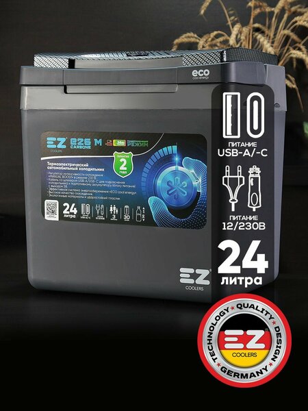 Ищете универсальное решение для хранения продуктов в дороге или на даче? Автомобильный Холодильник объемом 24 л EZ E26 M с питанием от 5В от USB пауэрбанка, от 12В прикуривателя в автомобиле и от обычной сети 220В станет идеальным спутником для всей семьи. Понижает температуру с 25 до 15 градусов всего за пару часов при работе от сети 220В! Сначала охладите холодильник, подключив его поработать некоторое время от сети 230 Вольт, затем заполните его максимально, чтобы крышка свободно закрывалась. Используйте в дороге от бортовой сети 12В или же от независимого источника 5 Вольт USB пауэрбанк. Вы можете наслаждаться холодным пивом, квасом или газированной водой, где бы вы ни были. Компактный и энергоэффективный, этот холодильник работает на принципе термоэлектрического охлаждения, обеспечивая надежное поддержание температуры. Термоэлектрический модуль при подаче питания становится сильно холодным и обдувается потоком воздуха внутри камеры холодильника, а снаружи горячий воздух отводится через отверстия вентиляции. Прочный пищевой пластик экологичен, не имеет запаха и абсолютно безопасен. Внешняя и внутренняя камеры холодильника надежно изолированы пеной высокой плотности, так что даже без питания вы сможете сохранить продукты холодными еще долгое время. Подключайте его в автомобиле через прикуриватель12В, используйте дома с розеткой 230В или подключайте от внешнего пауэрбанка проводом USB. Шнуры питания: USB 5 Вольт, автомобильный 12В и сетевой 220–230 В аккуратно хранятся в специальном отсеке. Холодильник работает практически бесшумно. Потребление энергии от пауэрбанка составляет всего 9 Ватт и позволяет работать автономно. Потребление энергии от сети 230 Вольт в экономичном режиме всего 48 Ватт, а на максимальной мощности 67 Ватт. Потребление от бортовой сети автомобиля 48 Ватт. Подключайте в прикуриватель без переходников и разветвителей. Прочный корпус не боится тряски, вибраций и перепадов температуры, что делает его идеальным для использования в автомобиле, кемпинге, на даче или на прогулке. Автомобильные холодильники EZ Coolers — не просто техника, а ваш комфорт в любом уголке мира. Пусть каждое путешествие будет вкусным и свежим! Гарантия производителя 2 года