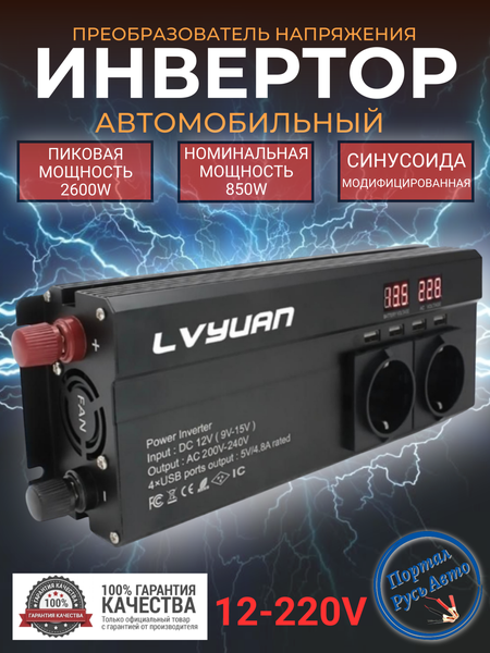 Преобразователь напряжения. Инвертор. Автомобильный преобразователь напряжения.2600w Пиковая выходная мощность: 2600 Вт - Непрерывная выходная мощность: 850 Вт - Выходная частота: 60 Гц/50 Гц -Форма выходного сигнала: модифицированная Синусоидальная волна Размер 310 мм * 120 мм * 60 мм Вес 1400 гр. На устройстве указана пиковая мощность. При успользовании долговременной нагрузки ориентируйтесь на номинальную мощность инвертора. Для модифицированного синуса номинальная мощность составляет 1/3 от пиковой ( например пиковая 3000вт-номинал 1000вт) Для чистого синуса 1/2 ( например пиковая 3000вт- номинальная 1500вт). -Интеллектуальный двойной цифровой дисплей, поддержка батареи адаптера солнечной панели.-Защита от перегрева, защита от высоких и низких температур, защита от перегрузки, защита от короткого замыкания и т. д.