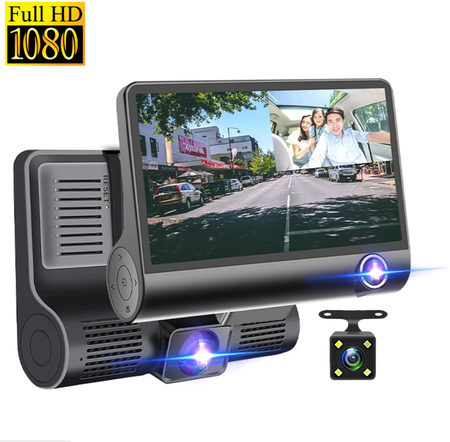 Автомобильный видеорегистратор Full HD 1080p с большим углом обзора и трехсторонней записью. Оснащен тpемя камерами, две камеры вмонтированы в корпус видеорегистратора. Одна камера направлена в сторону движения автомобиля и имеет удобную вертикальную регулировку относительно корпуса видеорегистратора, вторая камера направлена в салон автомобиля. Третья камера выносная, на длинном кабеле длиной 5.5 метров, который идет в комплекте для установки в задней части автомобиля. Основная камера обладает углом обзора 170 градусов в передней плоскости и максимальное разрешение записи 1680х960р (FullНD). Внутренняя и выносная камеры имеют угол обзора 140 градусов, что обеспечивает практически круговой обзор. Видеорегистратор имеет экран 4 дюйма для хорошей видимости, записывает события при ударах или других гравитационных изменениях в отдельную папку , которая не подлежит перезаписи. Дисплей видеорегистратора так же отображает всю необходимую информацию: текущие дату и время, качество съемки, режим съемки (фото/видео), микрофон обозначающий запись со звуком или без, изображения с двух камер одновременно (с фронтальной и салонной), индикатор заряда батареи. Выносная камера поможет вам контролировать процесс паркования или движения задним ходом. Широкий угол обзора до 170 градусов. Теперь вам не надо отвлекаться во время вождения чтобы посмотреть что же делает ребенок на заднем сидении, видеорегистратор будет транслировать все на дисплей. При движении задним ходом, камера работает как парковочная камера заднего вида и увеличивается на весь экран Циклическая запись без пауз между роликами. В видеорегистраторе есть встроенная функция HDR а также датчик удара G-Sensor. Устройство имеет 6 линзовый объектив благодаря этому ведется качественная ночная съемка. характеристики: Материал корпуса: Пластик Цвет: Черный Количество камер: 3 Диагональ дисплея: 4" дюйма Максимальное разрешение видео: 1080p, 720p Угол обзора камер: основная 170° градусов, фронтальная и наружная 140° градусов Формат фото: JPEG Формат видео: MOV Запись звука: Есть Поддержка карт памяти: до 32Гб Запись по датчику движения: есть Защита G-сенсор: есть Автоотключение экрана: есть Тип питания: Литий-ионный аккумулятор, автоприкуриватель12 – 24В Емкость аккумулятора: 340 мАч Размер упаковки, см: 20 х 12 х 7 Вес, гр: 385 В комплекте: Видеорегистратор – 1 шт. Наружная камера – 1 шт. Зарядное устройство – 1 шт. Присоска-держатель – 1 шт. Руководство пользователя – 1 шт.