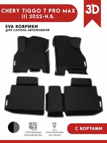 Автомобильные коврики с 3D бортами EVA для Chery Tiggo 7 Pro Max / Черри Тигго 7 Про Макс / 2022 - н. в. Коврики изготовлены из инновационного материала ЕВА (ЭВА). Форма ячеек: ромбы. Не пропускают воду. Толщина материала 1 см. Коврики выполнены строго по салону автомобиля, повторяют все контуры пола. В комплекте: водительский коврик - 1 шт, пассажирский коврик - 1 шт, коврик на задний ряд - 2 шт.