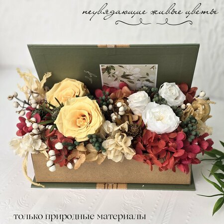 Живые стабилизированные розы с сухоцветами в стильной коробке книге - несомненно порадуют ваших близких и любимых. Интерьерные композиции из стабилизированных цветов вполне можно назвать произведением искусства. Такие букеты дома создадут живописные акценты в интерьере. Органично впишутся и в классический стиль, и в минимализм. Преимущество стабилизированных цветов: • живые стабилизированные розы радуют своей красотой счастливых владельцев круглый год; • при этом нет затрат на свежие букеты, которые быстро теряют природную красоту, а природная свежесть стабилизированных цветов держится несколько лет; • неувядающие цветы не требуют особенного ухода (достаточно избегать попадания на букет прямых солнечных лучей и поддержание нормальной влажности дома); • гипоаллергенны, поэтому безопасны для взрослых и детей, а также домашних питомцев; • обладают антисептическим эффектом ( но если скопилась пыль достаточно сдуть ее прохладным феном). Характеристики: • размер подарочного набора 20*25*15см; • состав букета: 5 шт. стабилизированных роз, гортензия, сухоцветы; • подарочный пакет; • подарочная книга кашпо. Можно использовать в качестве подарка бабушке, маме, подруге, сестре, жене, любимой, женщинам на 8 марта, в день рождение, на свадьбу, на выпускной, подарок учителю, букет на день учителя, на юбилей и прочие праздники.