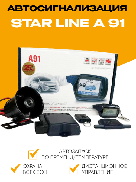 Автомобильная сигнализация с автозапуском и обратной связью, совместимая с StarLine A91 является представителем бюджетного семейства производителя. Несмотря на это, межбрелочная связь осуществляется по 8 каналам с трансивера-передатчика. За безопасность отвечает связь диалогового образца, метод плавающих каналов и 128-битный код. При каждом отправлении сигнала на брелок или наоборот, противоугонная система старлайн производит автоматический выбор альтернативной частоты. Пульт сигнализации Старлайн А91 оснащен ЖК дисплеем, на который приходит обратная связь с авто. Охранная автомобильная система безопасности поддерживает функции дистанционного запуска двигателя по времени и температуре, а так же турботаймер. В комплект авто сигнализации входит все необходимое для установки, а так же сирена.