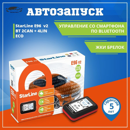 StarLine E96 V2 BT 2CAN+4LIN ECO — надежная автосигнализация c автозапуском, несканируемым диалоговым кодом, 2CAN+4LIN интерфейсом, Bluetooth Smart интерфейсом, 3D датчиком удара/наклона/движения, помехозащищенным трансивером, турботаймером и брелком с ЖК-дисплеем.