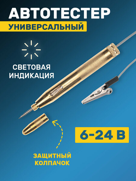 Универсальный автотестер предназначен для быстрой и эффективной диагностики электрооборудования автомобилей от 6 до 24В. Позволяет выявить замыкание и обрыв проводки или проверить предохранители, лампочки и диоды. Тестер имеет накручивающийся защитный колпачок. Корпус выполнен из металла и снабжен проводом с зажимом типа "крокодил" и световым индикатором. Тестер станет отличным дополнением к стандартному набору автомобилиста и поможет быстро идентифицировать неисправность в проводке Вашего автомобиля.