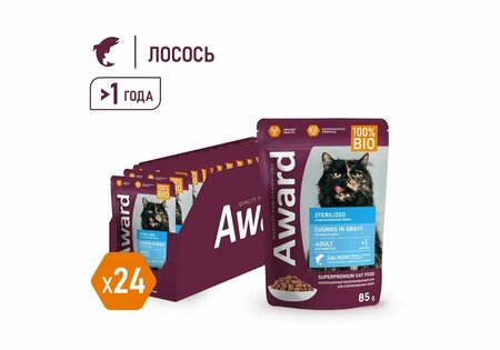 AWARD Sterilized влажный корм для взрослых стерилизованных кошек, кусочки в соусе с лососем, паучи - 85 г х 24 шт
