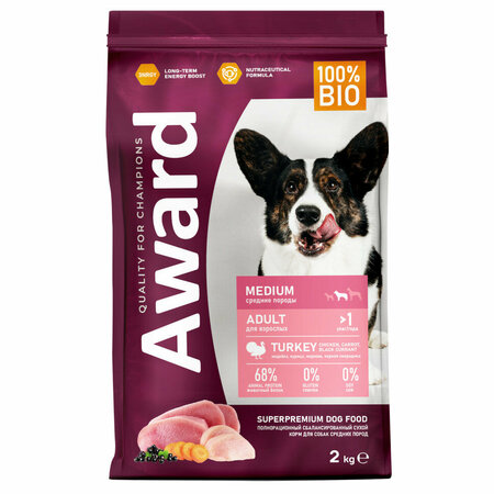 AWARD Корм для собакСухой корм для взрослых собак средних пород с индейкой и курицей с добавлением моркови и черной смородины 2 кг. Корм изготовлен из 100% натуральных ингредиентов по инновационной формуле — это обеспечивает комплексную нутрицевтическую поддержку организма питомца. При изготовлении корма использовалась технология 3NRGY — сочетание полезных углеводов, дающее длительный запас энергии и чувство сытости. Корм обогащен полиненасыщенными жирными кислотами, которые повышают качество шерсти и укрепляют иммунитет. Пробиотики и пребиотики помогают сохранять естественный баланс кишечной микрофлоры и способствуют оптимальному усвоению питательных веществ. В состав добавлена морковь — отличный источник клетчатки, улучшающий работу ЖКТ. Без красителей и консервантов. Состав Дегидрированное мясо курицы 16%, дегидрированное мясо индейки 11%, рис, овес, жир животный (свиной, куриный), чечевица зеленая, гидролизованные мясные белки, витаминно-минеральный комплекс (A, D, E, C, B1, B2, B4, B6, B12, ниацин, пантотеновая кислота, биотин, фолиевая кислота), сухие пивные дрожжи, семена льна, морковь, рыбий жир (лососевый), юкка Шидигера, черная смородина, цикорий, розмарин, пробиотики (Bacillus subtilis, Bacillus licheniformis). Питательная ценность: сырой белок 24%, сырой жир 15%, влага 9%, сырая зола 7,0%, сырая клетчатка 2,5%. Энергетическая ценность (средние значения) на 100г: 378,5 ккал. Витамины и минералы на 1 кг: витамин А 17 000 МЕ/кг, витамин D 900 МЕ/кг, витамин E 350 МЕ/кг, кальций 1,35%, фосфор 1%, цинк 130 мг, медь 10 мг, железо 90 мг, йод 2,5 мг, селен 0,2 мг, натрий 0,3%, калий 0,6%. Добавки на 1 кг: Глюкозамин 350 мг, Хондроитин 100 мг, L-карнитин 150 мг, Омега-3 - 0,45%, Омега-6 - 2,45%. Рекомендуемую ежедневную порцию корма (см. таблицу на упаковке или на сайте) можно разделить на два кормления. Индивидуальные потребности в питании могут отличаться в зависимости от размера, возраста и активности питомца. У собаки всегда должен быть доступ к свежей питьевой воде. Рекомендуется вводить корм в рацион питомца постепенно в течение недели. Корм предназначен исключительно для домашних животных и не предназначен для употребления в пищу человеком.