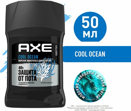 Насладись новым 100% топовым* ароматом от AXE – антиперспирантом-карандашом Cool Ocean. Аромат, как всегда, разработан в сотрудничестве с одним из лучших парфюмерных домов. На этот раз он раскрывается мощными акватическими аккордами в сочетании с дерзкой свежестью дикой мяты. Не маскируй запах пота, блокируй его! Добавь в свой ежедневный уход комплексную надежную защиту 2 в 1 от пота и запаха нон-стоп 48ч** AXE Cool Ocean и будь на пике уверенности и привлекательности весь день. Формула стика Cool Ocean обеспечивает антибактериальный эффект для надежной защиты от запаха пота на 48 часов**. Антиперспирант AXE эффективно борется с неприятным запахом, не просто маскируя его ароматом парфюма, а блокирует его, воздействуя на основную причину его появления – бактерии. Супер удобный компактный формат то, что нужно для долгого использования. Равномерное и быстрое нанесение без эффекта влажной или липкой пленки, только приятное ощущение мягкой сухости после нанесения. Смягчающие и увлажняющие ингредиенты обеспечивают мягкое воздействие на кожу. Аромат также представлен в формате дезодоранта-аэрозоли. Выбирай свой формат! Для максимального эффекта воспользуйся гелем для душа 2 в 1 AXE Cool Ocean с технологией усиленной защиты* от пота и запаха. Он качественно смывает бактерии, бережно очищает и ухаживает за кожей и волосами пока ты в душе. Еще больше лайфхаков и новых крутых новинок – на сайте www.axe.com. Вливайся. *в линейке продукции Unilever. **клинически протестировано Unilever.