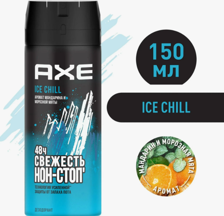 Хей, мэн, как насчет свежевыжатого мандаринового сока со льдом и нежными нотами пряных трав? Звучит слишком хорошо, чтобы пользоваться только летом, а? AXE Ice Chill — супернаходка для самого горячего парня по ту сторону экрана. Мужской дезодорант спрей AXE Ice Chill — мощный коктейль для самого свежего начала дня! Революционная формула AXE 2в1 сочетает в себе топовый* аромат и защиту от запаха пота на 48 часов**. Нанеси аэрозоль сразу после душа, чтобы чувствовать максимум уверенности в течение дня — в себе и своем образе! В состав дезодоранта аэрозоля AXE мы добавляем цинк, который обеспечивает антибактериальный эффект. Догадываешься, что это значит? Правильно, дезодоранты AXE для мужчин справится не только с запахом пота, но и с его причиной. Этакий спидран с моментальным выходом на финального босса. В этой катке у тебя есть мощный баф на целых 48 часов**. Используй его по максимуму! Да, и еще. Речь о парфюмированном дезодоранте. Значит, он может больше, чем обычная защита от запаха пота. AXE Ice Chill — это крышесносная композиция из ярких, свежих нот мандарина и морозной мяты. Утро в такой компании просто обязано быть добрым! Дезодорант спрей AXE во флаконе 150 мл — самый удобный формат для твоего домашнего арсенала****. Но ты также можешь взять его с собой в качалку или на ночевку к другу или девушке. В общем, везде, где тебе может потребоваться душ. Нужно больше цитрусовой свежести? Попробуй начинать свой день вместе с гелем для душа AXE Ice Chill, дарящим чувство свежести и нежный цитрусовый аромат на 12 часов***. Это будет настоящий айс чилл! Попробуй AXE эффект! *в портфеле продукции Unilever. **Защита от запаха пота до 48 часов — 48ч unfragranced MMS тест, Unilever R&D, 2018. ***по тесту оценки стойкости аромата, Unilever R&D, 2020. ****в портфеле продукции Unilever.
