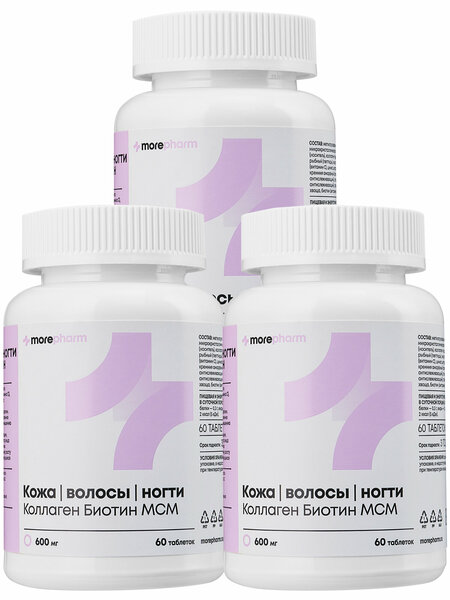БАД «Кожа Волосы Ногти» от бренда Morepharm – это уникальная формула, которая разработана для поддержания здоровья волос, сияющей кожи и крепких ногтей, питая вашу красоту изнутри. Витаминный комплекс имеет органический состав и способствует восстановлению и обновлению структуры кожи, предотвращению появления новых морщин, улучшению цвета лица и состояния волос и ногтей. Выпадение волос, дряблая кожа, хруст в суставах, слоящиеся ногти - все эти проблемы возникают в связи с замедлением синтеза и недостатком коллагена в организме. Витамины для кожи и волос нормализуют процесс синтеза коллагена, и идеально подходят как для женщин, так и для мужчин. Витамины skin nails and hair изготовлены из премиум сырья, которое имеет самую высокую степень очистки. Именно из-за высокой степени очистки основные компоненты БАДа «Кожа Волосы Ногти» от бренда Морефарм быстро усваиваются организмом. Гидролизованный морской коллаген укрепляет опорно-двигательный аппарат, восстанавливает соединительную ткань, стимулирует обменные процессы и регенерацию, активизирует выработку синовиальной жидкости, нормализует водно-солевой обмен. Он также укрепляет ногти, зубы, волосы, повышает тонус кожи. Метилсульфонилметан (МСМ) участвует в формировании соединительной ткани, биосинтезе коллагена, способствующего эластичности кожи и укреплению мышц, способствует заживлению ран, оказывает положительный эффект на состояние кожи и рост волос. Пролин составляет основную часть белка соединительной ткани коллагена, который заботится о нашей коже, волосах. Являясь главной составляющей коллагена, пролин улучшает состояние, структуру кожи, предотвращает быстрое старение, образование морщин, способствует здоровому состоянию и обновлению кожи. Цинк повышает выработку интерферонов, способствующих защите организма против инфицирования вирусами, бактериями. Цинк препятствует распространению вируса в клетке, защищает от разрушения лимфоциты, усиливает функции тимуса (вилочковая железа). Способствует укреплению иммунитета, повышению сопротивляемости организма к инфекциям, снижает риск развития и уменьшает длительность простудных и вирусных заболеваний. Витамин С обладает антиоксидантными свойствами, усиливает синтез коллагена в коже человека, влияет на биосинтез эластина. А также обладает антиоксидантными свойствам, способствует укреплению иммунитета, повышению сопротивляемости организма к инфекциям, снижает риск развития и уменьшает длительность простудных и вирусных заболеваний. Лизин нормализует повышенную сосудисто-тканевую проницаемость и оказывает противоотечное и обезболивающее действие. Оказывает противовирусную активность, особенно в отношении вируса герпеса, способствуя значительно увеличивать промежутки между рецидивами. Содержание биологически активных веществ в 4 таблетках (суточном приёме): Коллаген гидролизованный рыбный (пептиды), Метилсульфонилметан - 1000 мг, Пролин (из коллагена) - 50 мг, Лизин - 50,5 мг, Витамин С - 120,8 мг (201,3% от норм потребления), Цинк - 24,8 мг (165,3% от норм потребления), Кремний - 49,5 мг (165% от норм потребления), Медь - 2, мг (201,6% от норм потребления), Витамин В7 (биотин) - 0,1 мг (198% от норм потребления).