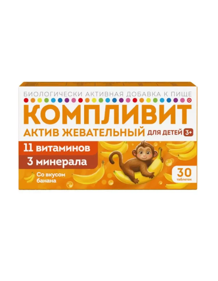 БАД Компливит Актив вкус банан для детей с 3 лет таблетки жевательные 1300 мг упаковка контурная ячейковая №30 (БАД)