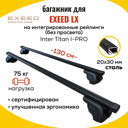 Комплект багажника Inter Titan i-Pro 130см 20x30 (поперечины и упоры) для Exeed LX (Эксид Лх) с интегрированными (без просвета) рейлингами. (4 упора черные + 2 перекладины прямоугольного сечения, черные) Внимание! Данная багажная система подходит для автомобиля: Exeed LX (Эксид Лх) с интегрированными (без просвета) рейлингами. Багажная система для Exeed LX (Эксид Лх) состоит из: