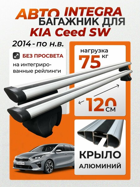 Комплект багажника Integra-120 крыло (поперечины и упоры) для Kia Ceed SW (Киа Сид СВ) на интегрированные (без просвета) рейлинги. (4 упора черные + 2 перекладины крыловидного сечения в серебристом цвете) Состоит: (4 упора черные + 2 перекладины крыловидного сечения в серебристом цвете.) Заглушки в торцах поперечин закрывают доступ к механизму крепления. внимание! Данная багажная система предназначена исключительно для автомобиля Kia Ceed SW Специальные опоры-адаптеры внутри имеют мягкий резиновый уплотнитель, Вы не поцарапаете свой рейлинг во время установки. внимание! цвет опоры черный, материал пластик. Цвет поперечных дуг серебристый. Материал дуги - алюминий, сечение крыловидное. В верхней части дуг имеется паз, в который вставлена уплотнительная резинка, она защищает поверхность дуги от соприкосновения с грузом и не дает грузу скользить. Данный паз может быть использован для установки дополнительный аксессуаров, типа ограничителей груза, креплений для перевозки лыж или велокреплений. В нижней части дуги тоже имеется паз, по которому могут перемещаться опоры. данный паз так же закрывается резиновым уплотнителем, который идет в комплекте. Внимание! Если нижний паз не закрыть резинкой, то дуги будут издавать свист и шум. Просьба иметь это ввиду!